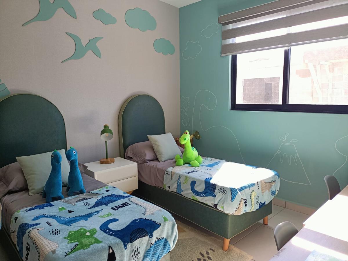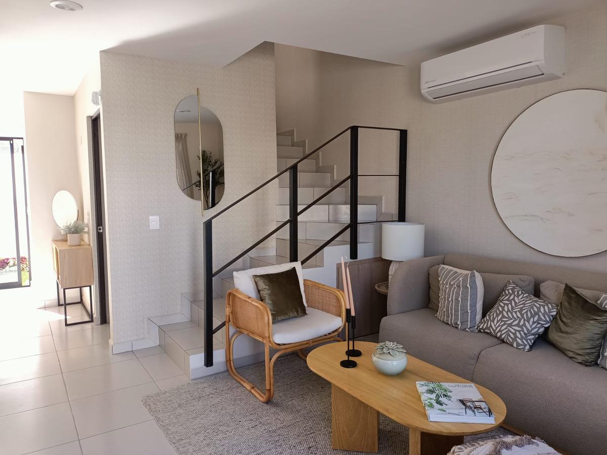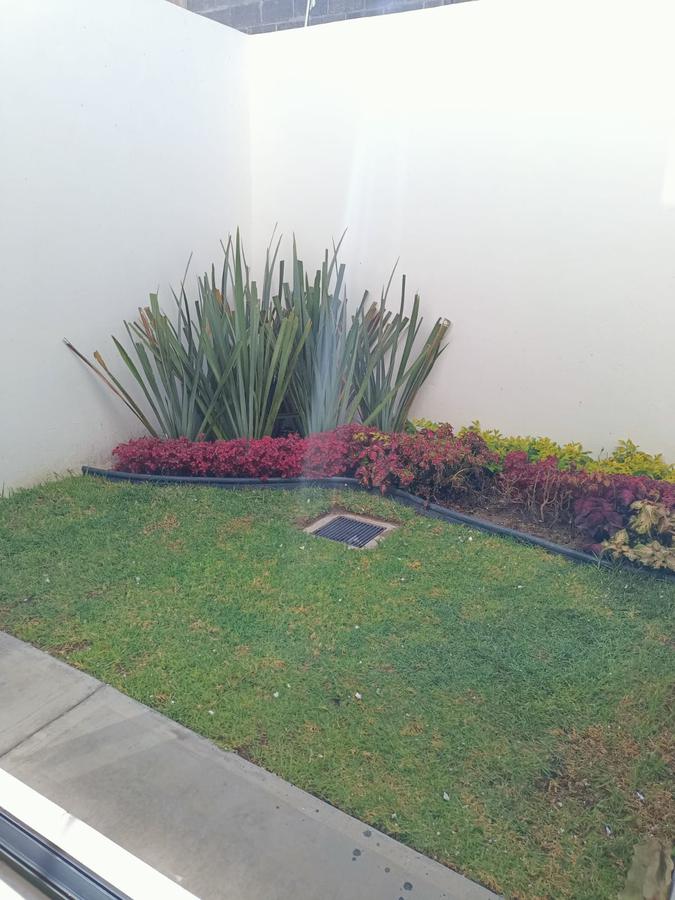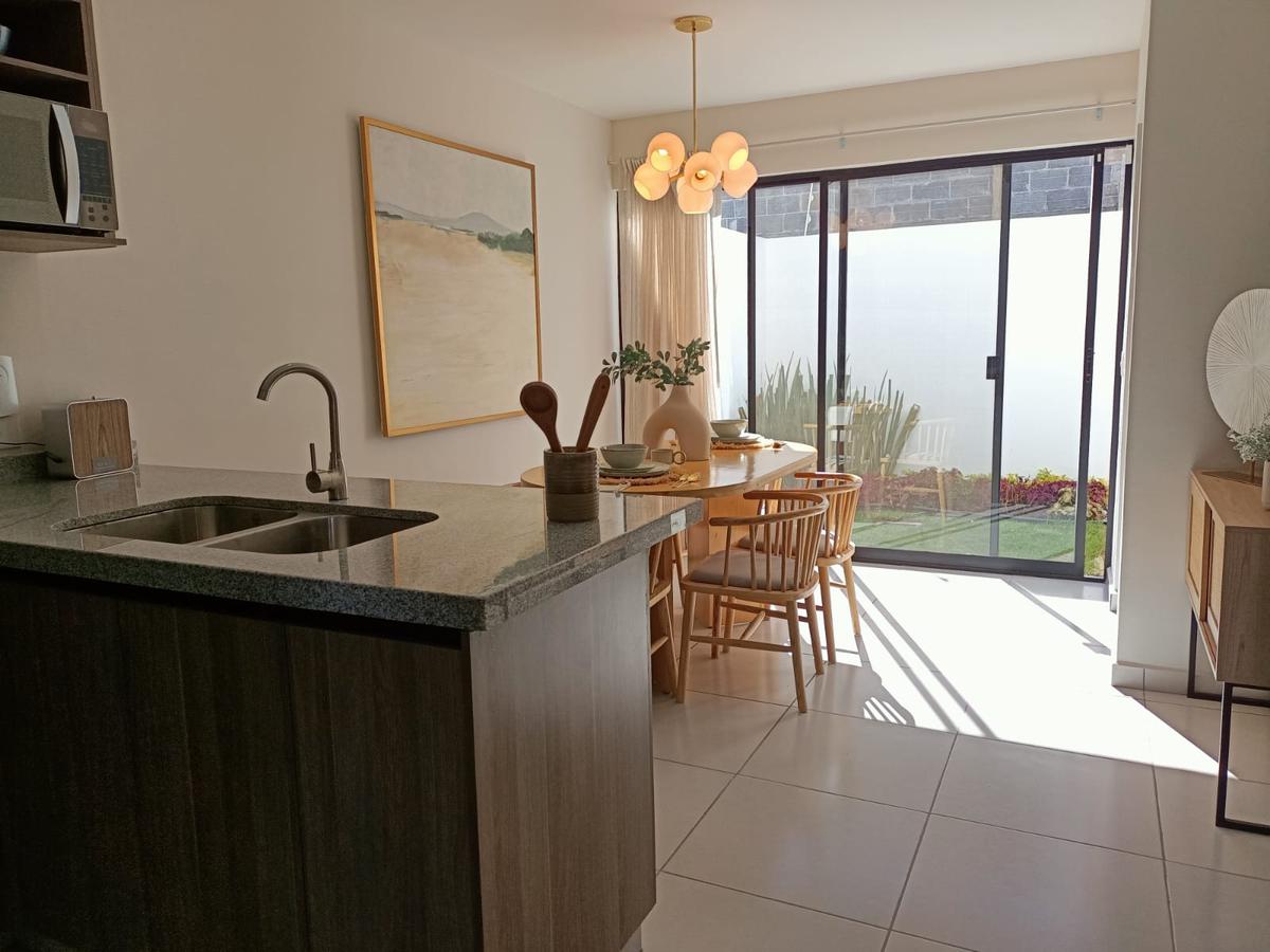 Cochera para 2 autos, sala, comedor, cocina equipada, recámara, baño completo, cuarto para lavado, terraza con jardín, cisterna.