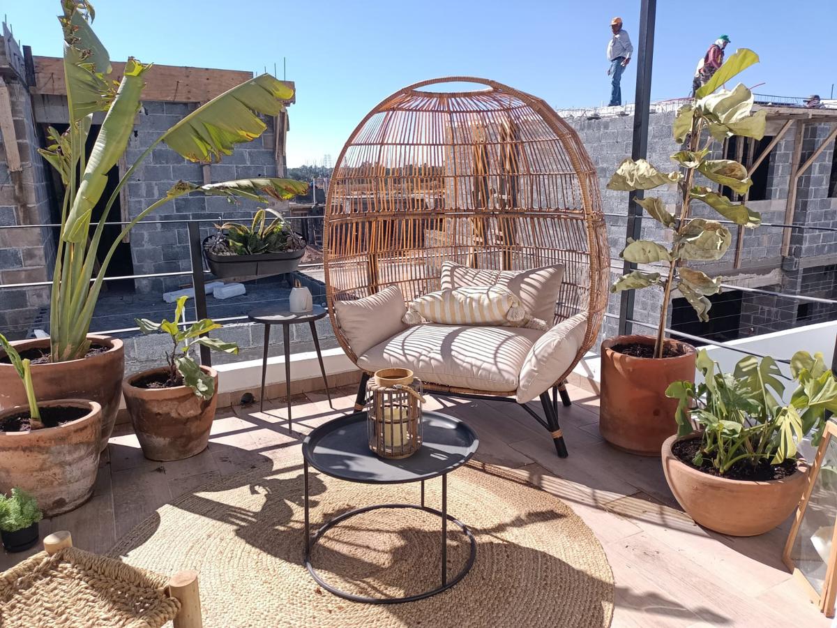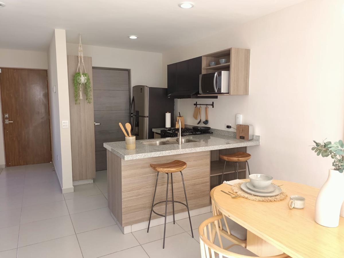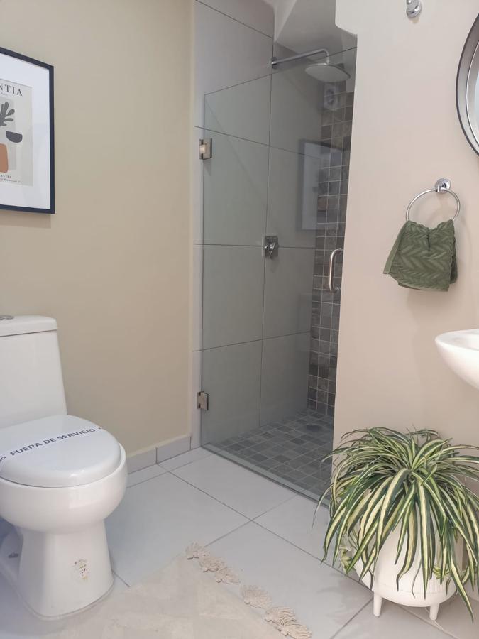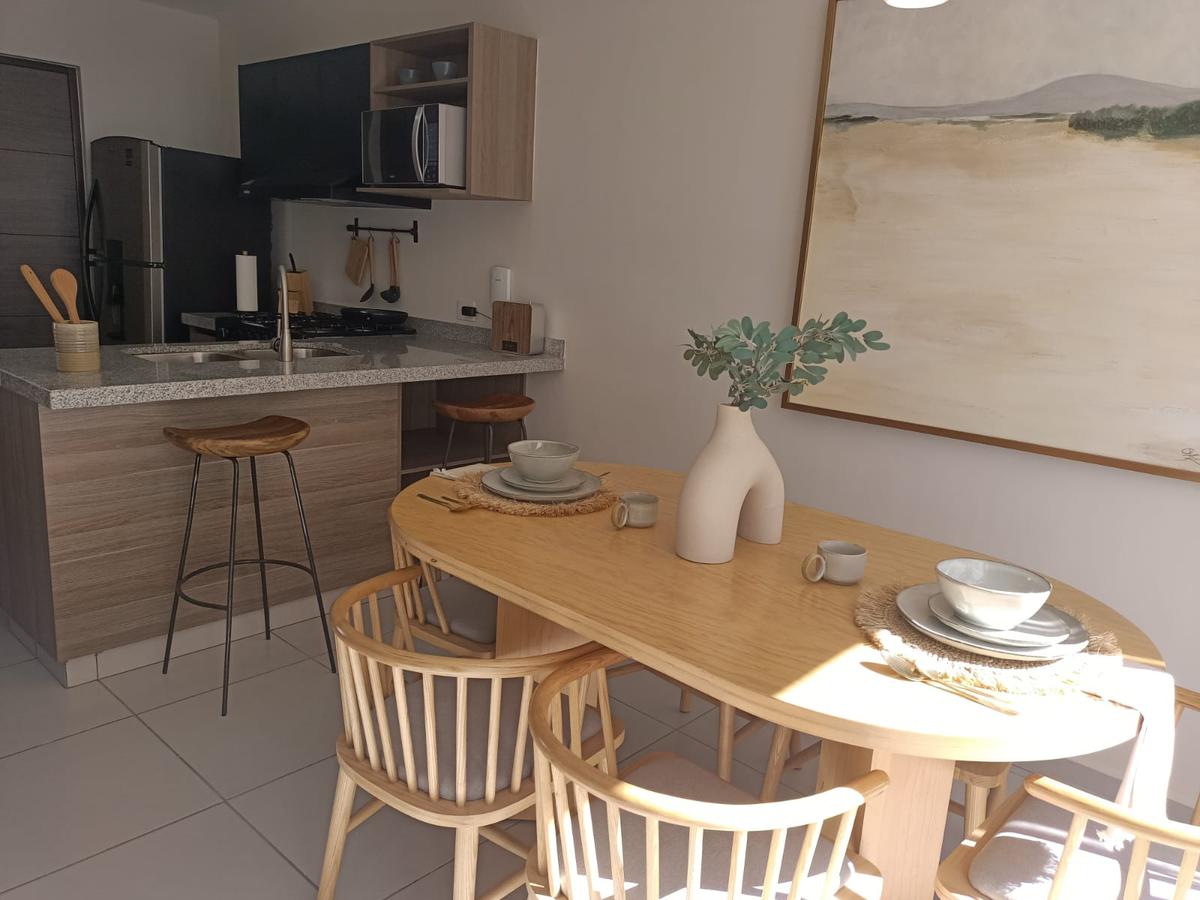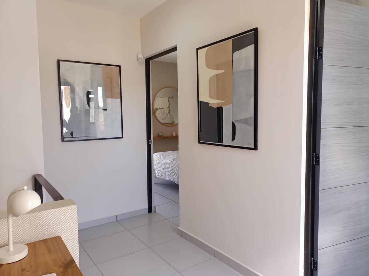 Cochera para 2 autos, sala, comedor, cocina equipada, recámara, baño completo, cuarto para lavado, terraza con jardín, cisterna.
